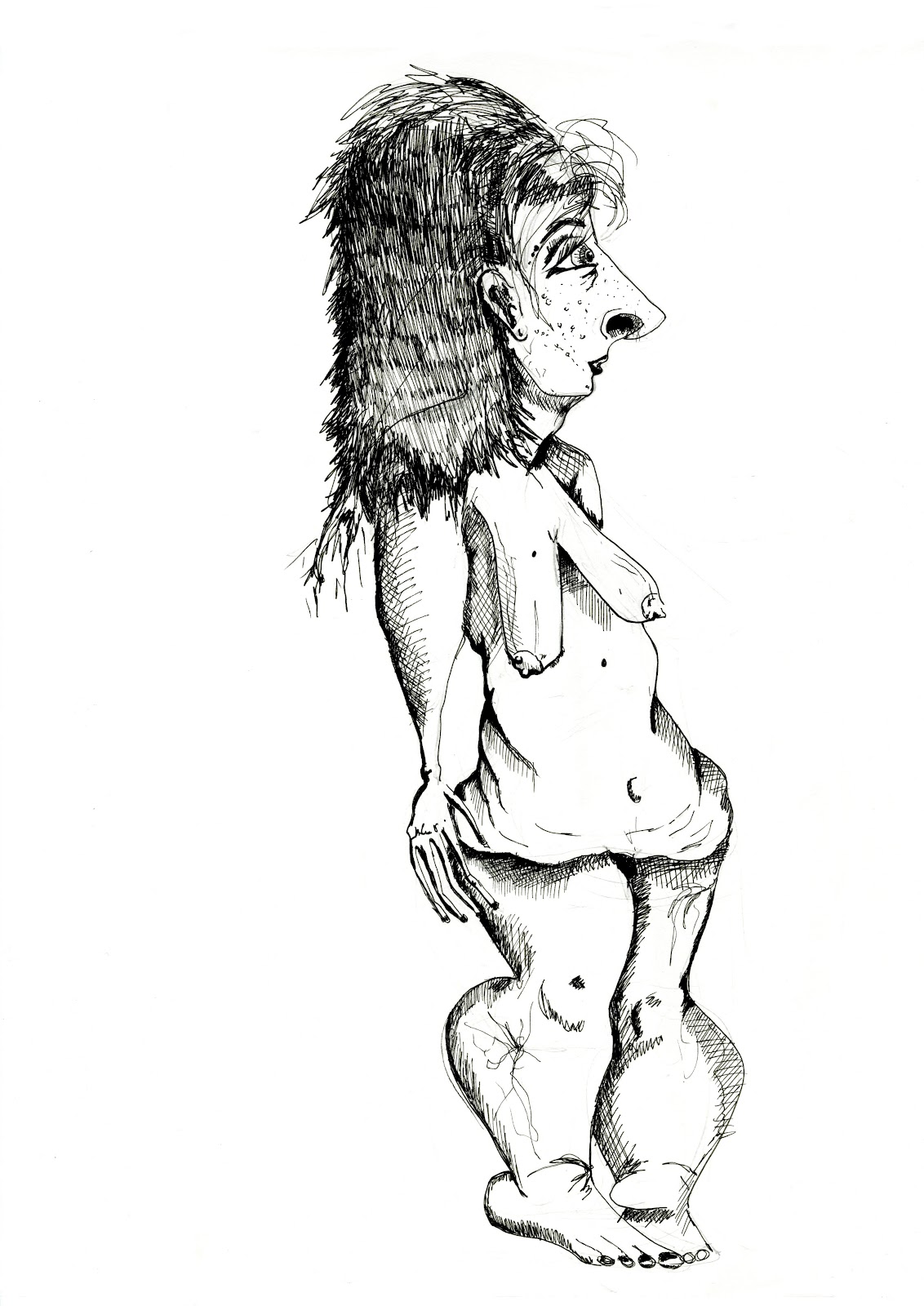 This work is call Me at the Present Time. 14in x 17in Micron on Bristol. This was the first drawing of this character I ever created. This is how I see myself. You will notice as she evolves, her body changes. This relates to my life because every time I look in the mirror, I see something different. Sometimes I like my nose, and other times I wish I could carve it off my face with a sharp blade. Notice the folds in her body. Notice the thick black outline. She is trapped inside this body. There is no way out. I am happy to have you meet her.